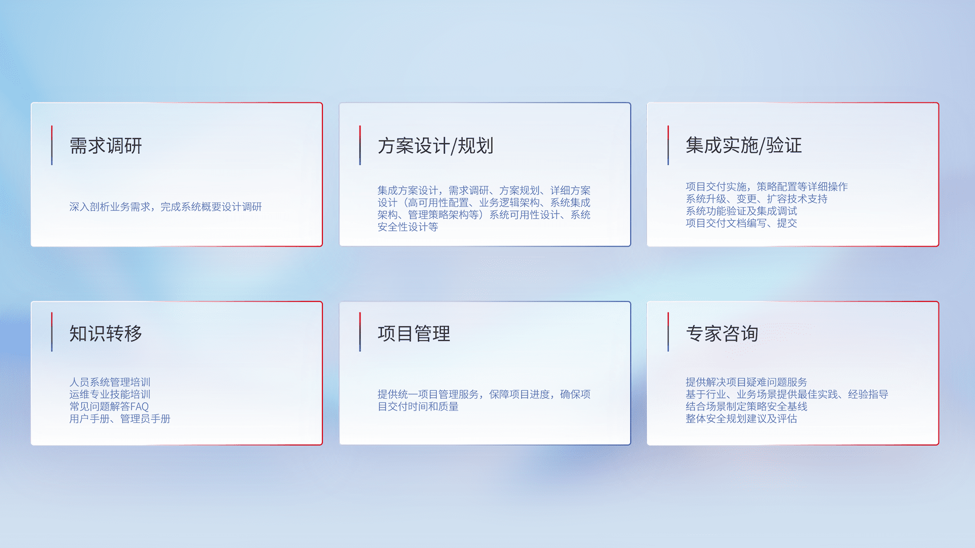 针对客户行业特性,,,将宏观的安全战略和需求,,,,通过专业的交付服务,,,实现项目落地,,,为客户提供标准规范的集成交付服务。。。。